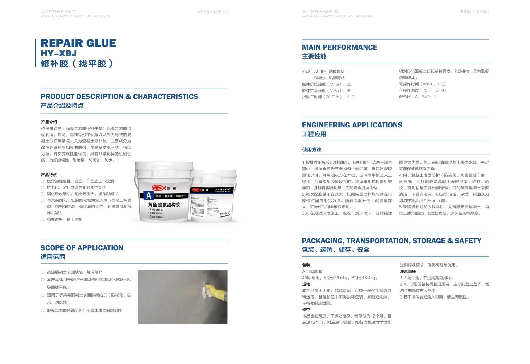 上海辉鱼修补胶为A/B双组份改性环氧型,高触变性不流淌,粘接强度高且固化收缩率低。与混凝土、金属基材紧密粘结,耐酸碱抗老化,耐冻融循环。施工便捷可涂刮,适配混凝土结构坑洞、掉角、裂缝修补及加固找平,工程专用强度高。
