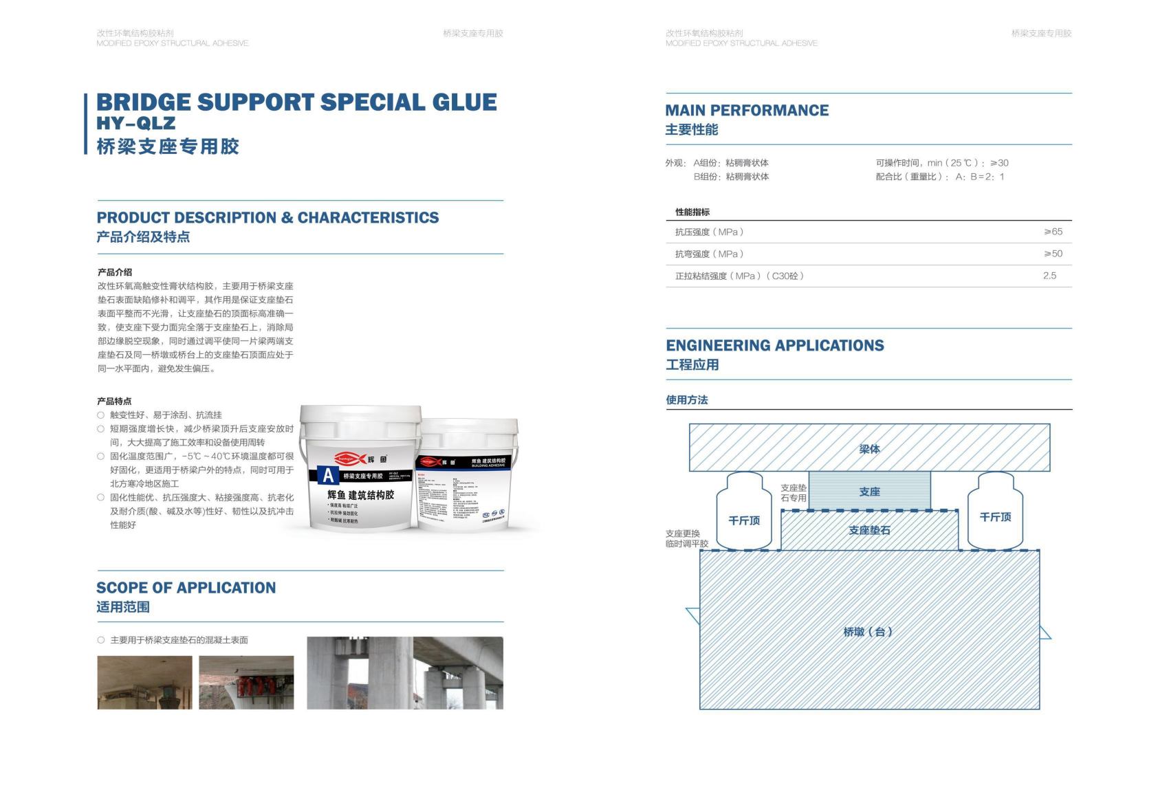 上海辉鱼桥梁支座专用胶为A/B双组份改性环氧胶,高触变性立面施工不流挂,适配支座垫石调平、混凝土修补及裂缝封闭。粘接强度高,抗疲劳抗冲击,固化收缩率低,耐酸碱盐雾、抗老化,与钢、混凝土基材粘结牢固。宽温域可施工,强度提升快,施工效率高,符合桥梁工程相关国标,适配公路、市政桥梁支座更换与加固全工况。