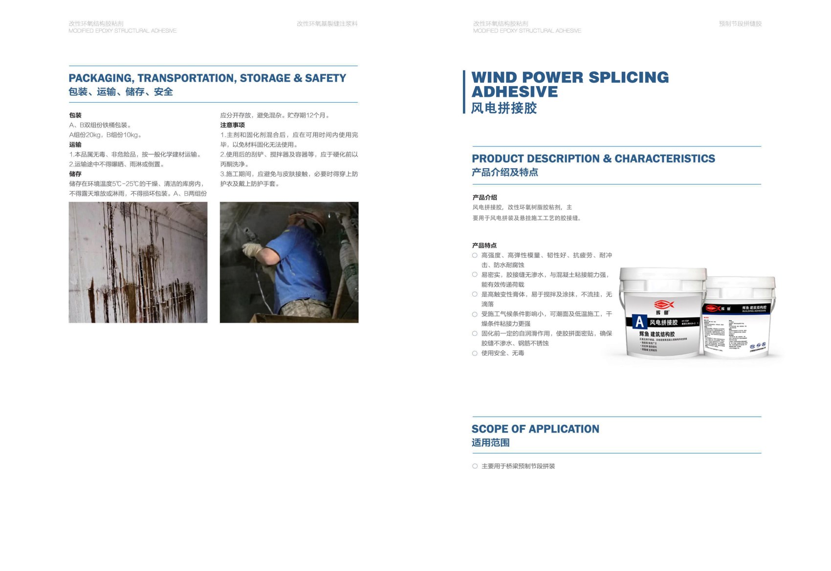 上海辉鱼风电拼接胶(塔筒胶粘剂)为改性环氧双组份胶,适配风电塔筒预制管片横竖缝拼接,高模量低徐变,粘接强度高且抗疲劳冲击,能有效传递荷载保障塔筒结构稳定。触变性佳立面施工不流挂,可操作时间长且固化迅速,耐高低温、抗紫外线盐雾,耐候防腐性优异,适配户外严苛风电工况。与混凝土、金属等基材粘结紧密,胶缝密实不渗水,低温可施工,适配陆上 / 海上风电塔筒组装,助力塔筒结构长效稳固。