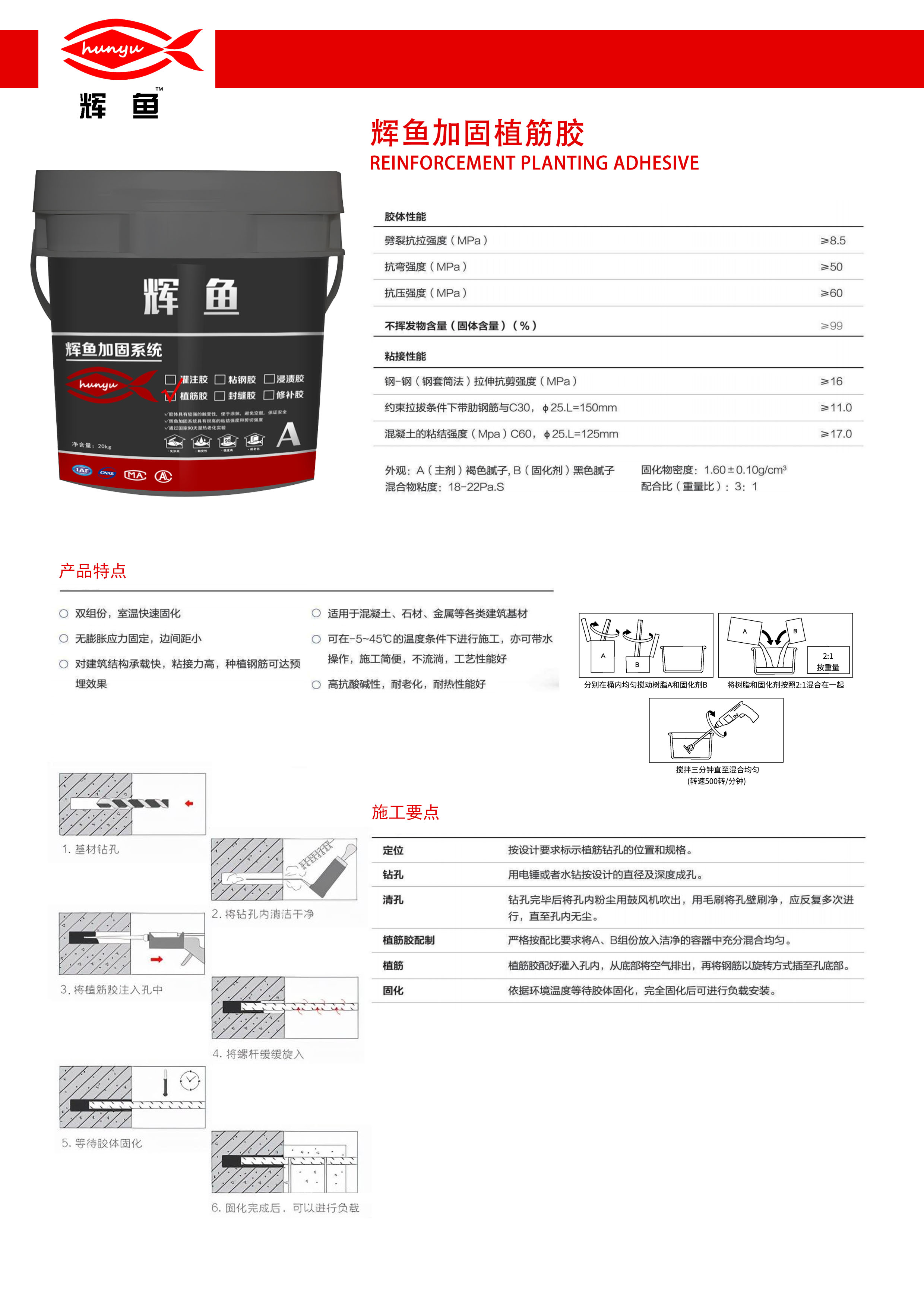上海辉鱼桶装植筋胶为 A/B 双组份改性环氧胶,按比例混合后常温固化,锚固力强如预埋,适配混凝土中钢筋、螺杆埋植与结构加固。耐酸碱、抗老化,无溶剂环保无腐蚀,固化收缩率低,粘结力均匀稳定。10kg/20kg 大桶装,适配机械搅拌 + 压力注胶,适合厂房、桥梁、地下室等大批量植筋工程,施工高效、综合成本低。
