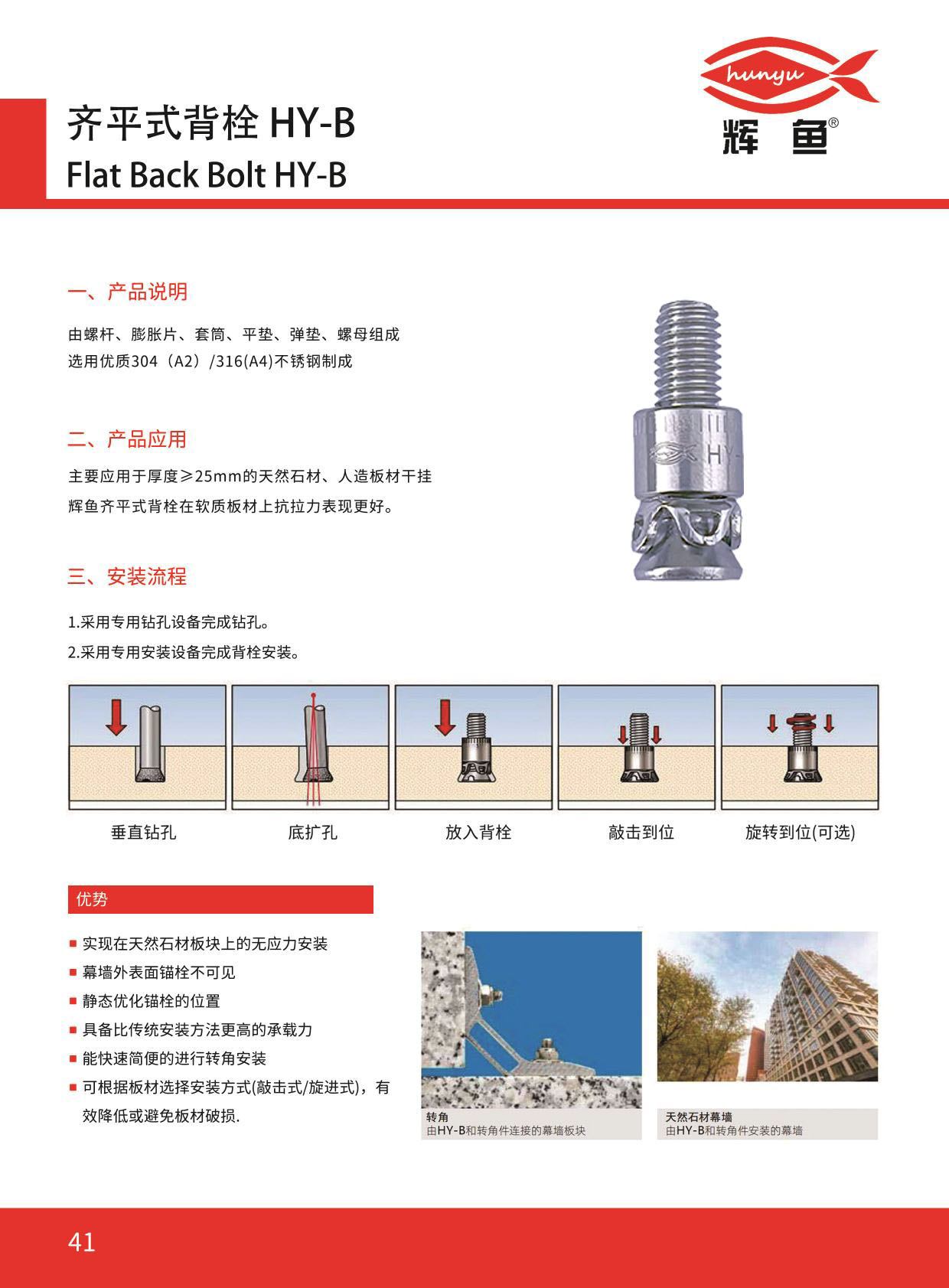 上海辉鱼齐平式背栓为石材幕墙专用机械锚固件,主体采用 304/316 不锈钢材质,抗腐耐候性佳,适配 20mm 及以上天然石材板材。安装后与石材背面齐平,形成机械锁键连接,无膨胀应力不损伤板材,幕墙外表面无锚栓外露,兼顾锚固强度与外观美观。支持敲击 / 旋进式安装,适配石材幕墙室内外干挂、转角板安装等场景,受力合理承载力高,板块抗变形性强,且安装便捷、后期可单独更换石材板块,全规格适配各类石材幕墙工程需求。